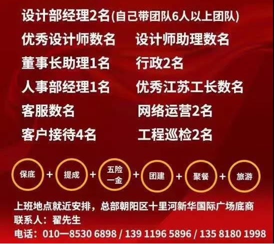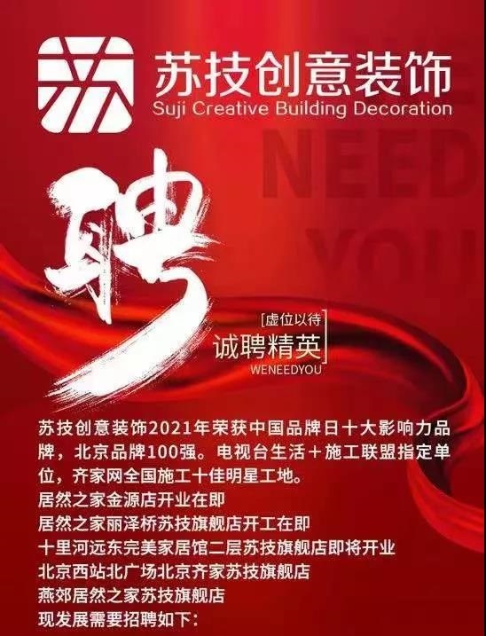 蘇技創(chuàng)意裝飾作為京城老牌裝企,打響了“裝修就找江蘇工人”的品牌,樹立了江蘇技工的良好口碑,成為北京最受業(yè)主歡迎的裝飾公司之一。如果你想在裝飾行業(yè)施展才華實(shí)現(xiàn)抱負(fù),蘇技是你最好的職業(yè)發(fā)展選擇,我們?yōu)槟銣?zhǔn)備了自由發(fā)揮的廣闊舞臺。我們誠邀以下崗位的專業(yè)人才加盟蘇技創(chuàng)意,希望你我攜手領(lǐng)跑行業(yè),共同實(shí)現(xiàn)職業(yè)夢想。