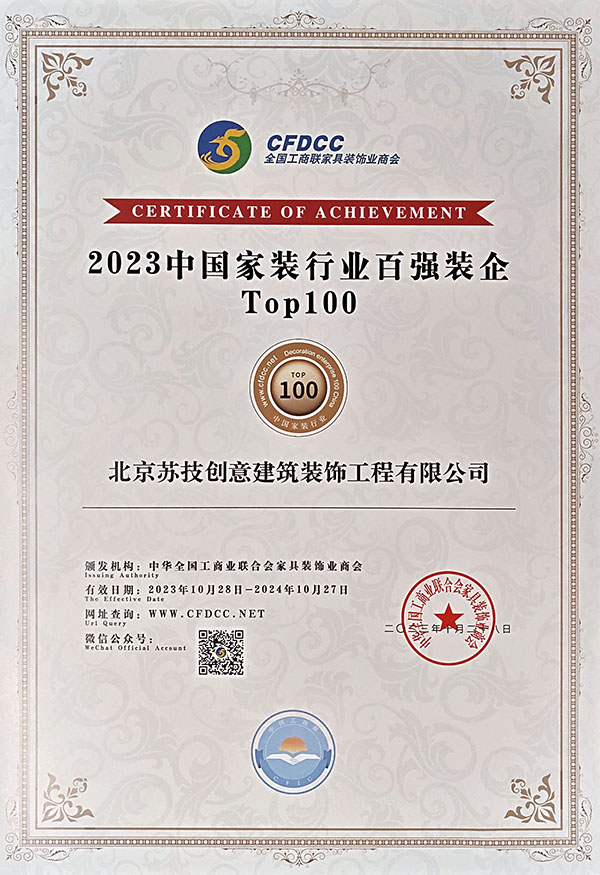喜訊!由中華人民共和國工業(yè)和信息化部指導,中華全國工商業(yè)聯(lián)合會家具裝飾業(yè)商會頒發(fā),北京蘇技裝飾獲得“2023中國家裝行業(yè)百強裝企”榮譽稱號。