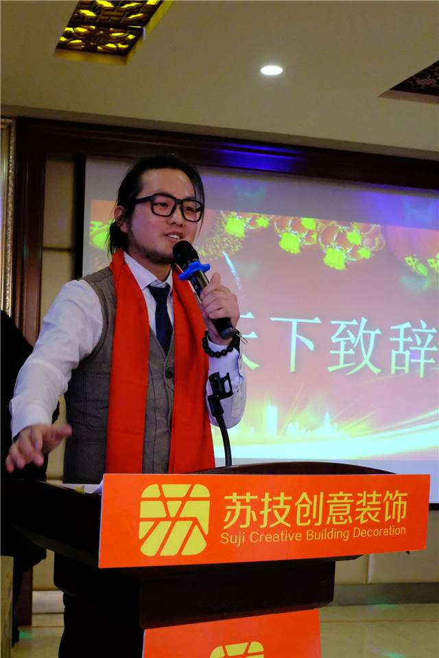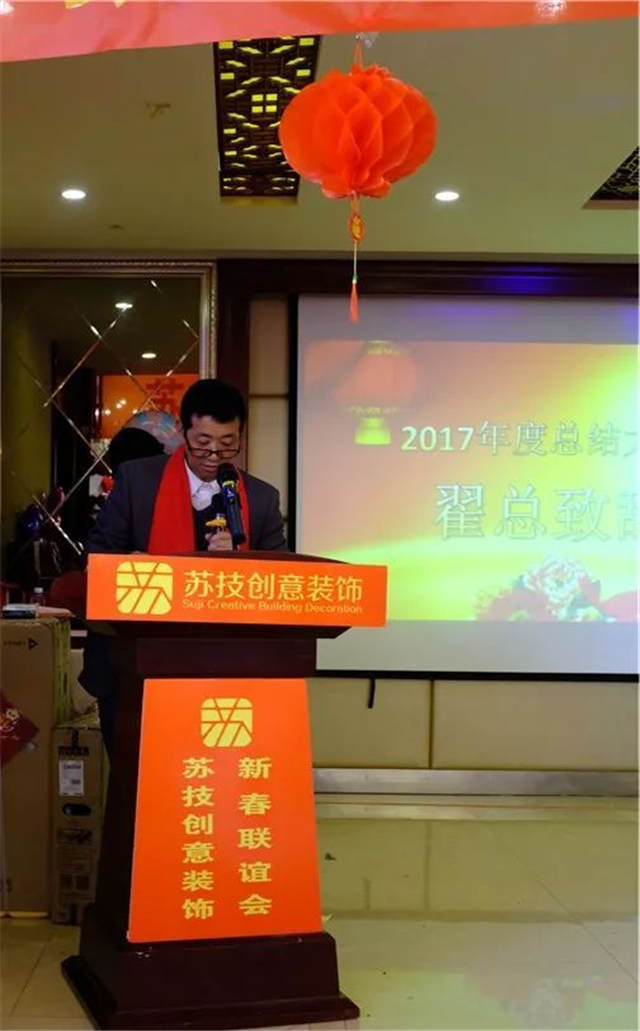 公司董事長翟存祥致新春賀詞。在致辭中,翟存祥董事長代表公司以及個人向與會嘉賓送上新春的祝福和誠摯的感謝,感謝大家在過去的一年里攜手相伴,也感謝大家為蘇技創(chuàng)意的發(fā)展和突破所付出的辛苦和努力。翟總表示,2017年于蘇技創(chuàng)意而言,有著非常重要的意義,是蘇技創(chuàng)意品牌發(fā)展非常關(guān)鍵的一年。這一年里,蘇技創(chuàng)意裝飾內(nèi)抓管理,外抓市場,面對壓力與挑戰(zhàn),實現(xiàn)品牌影響力與經(jīng)營業(yè)績的雙增長。2018年,蘇技裝飾將砥礪前行,創(chuàng)造奇跡,完成超越!