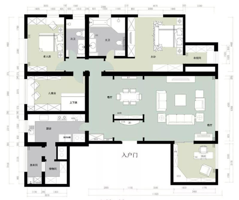 原始戶型長這個樣子也許您已經發(fā)現(xiàn),這套戶型入戶門在客餐廳的中間,開門就能將室內空間飽收眼底,在獲得空間開闊感的同時家中的隱私也全部一覽無余。與此同時,空間功能劃分上也不是很明確,家具入場后會給人雜亂無章之感。對此,萬丹彤設計師果斷“下刀”,從門廳開始進行戶型調整。以下是改造后的空間布局。