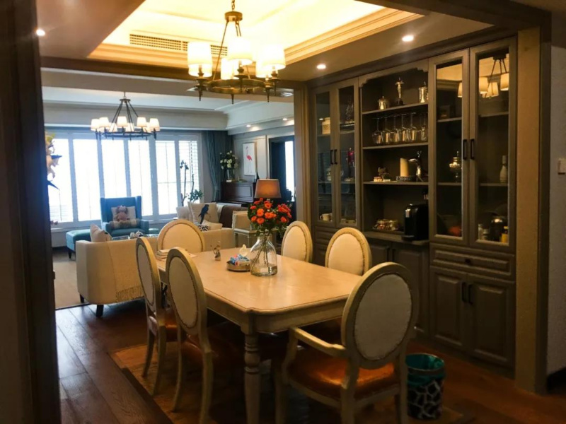 客廳餐廳客廳電視背景墻同樣采用的也是石膏線作為主要裝飾元素,讓電視背景墻和沙發(fā)背景墻形成呼應,更加突出空間的流動性和整體感。暖色的光線投射在墻壁上,使得房間顯得更加溫馨!客廳餐廳一體已經逐漸成為流行趨勢,直觀的好處是空間通透,漂亮大氣,空間使用率最高。卡其色的餐邊柜與室內整體風格協(xié)調呼應。